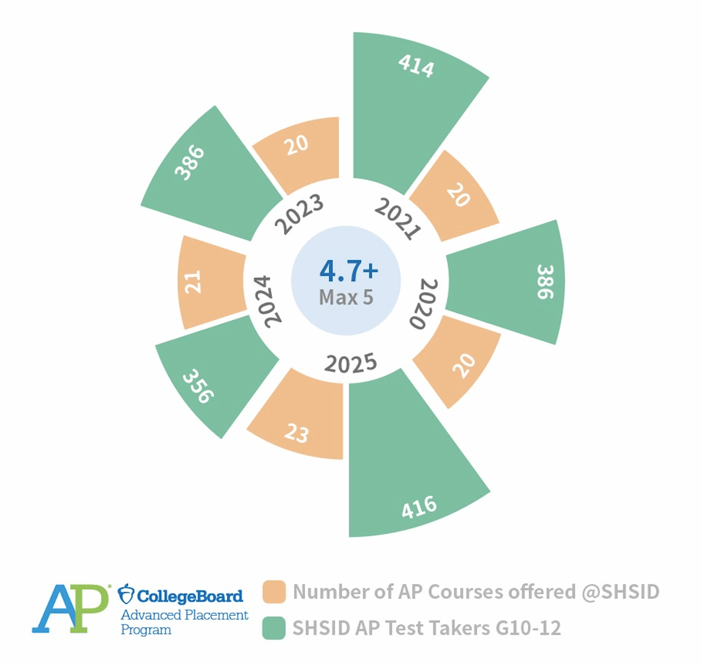 SHSID has been providing students with AP courses and exams since 2008. At present a total of about 20 courses are offered, including literature and language, mathematics, sciences, humanities, art, computers, and so on. Thanks to its pre-university teaching programs and management expertise, SHSID has provided students with quality AP teaching from the very beginning of this program. The average for recent years has been consistently over 4.5 (out of 5), which is well above the world average.