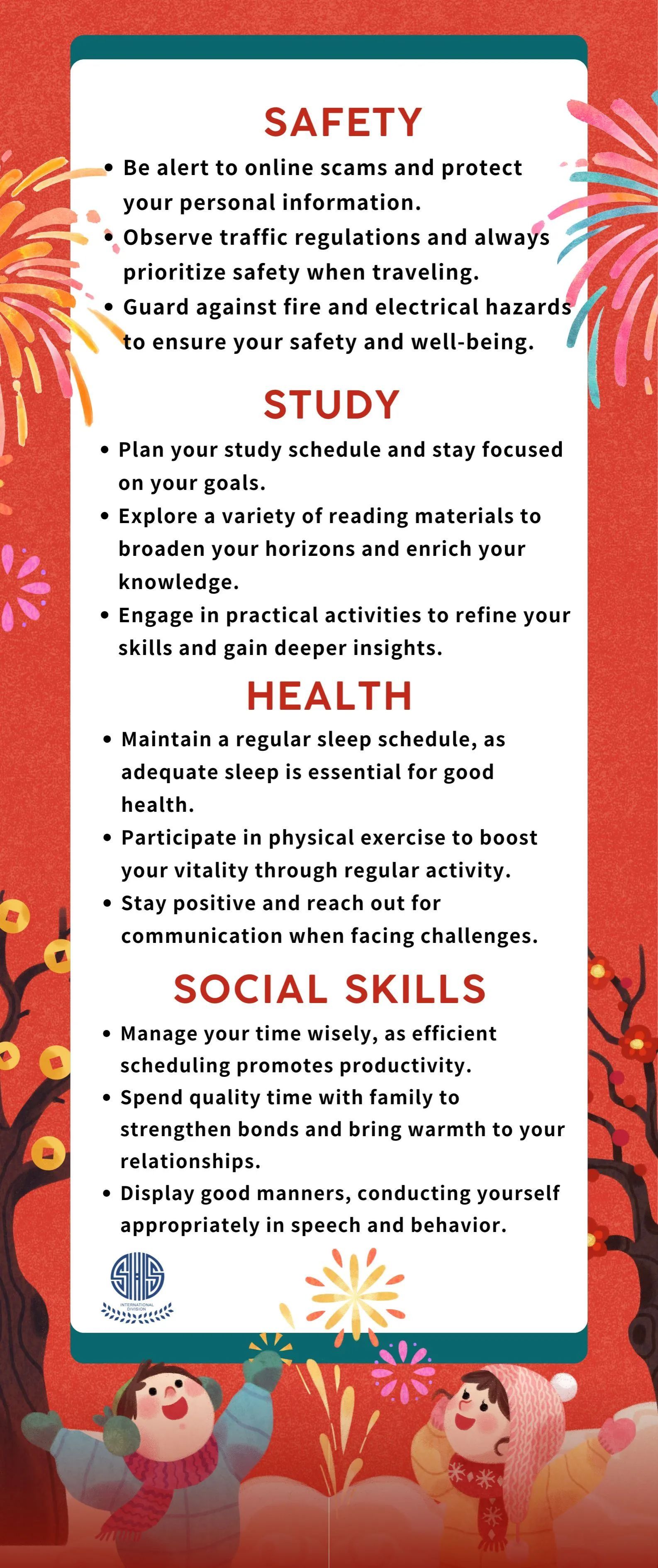 The winter vacation for the 2024 academic year has begun. The new semester is scheduled to start on February 17, 2025. Before the start of school, the homeroom teachers will contact parents in advance to inform them of related matters. Winter vacation has begun, and the Spring Festival is just around the corner. While enjoying a joyful holiday, we have also prepared a winter vacation guide for you.