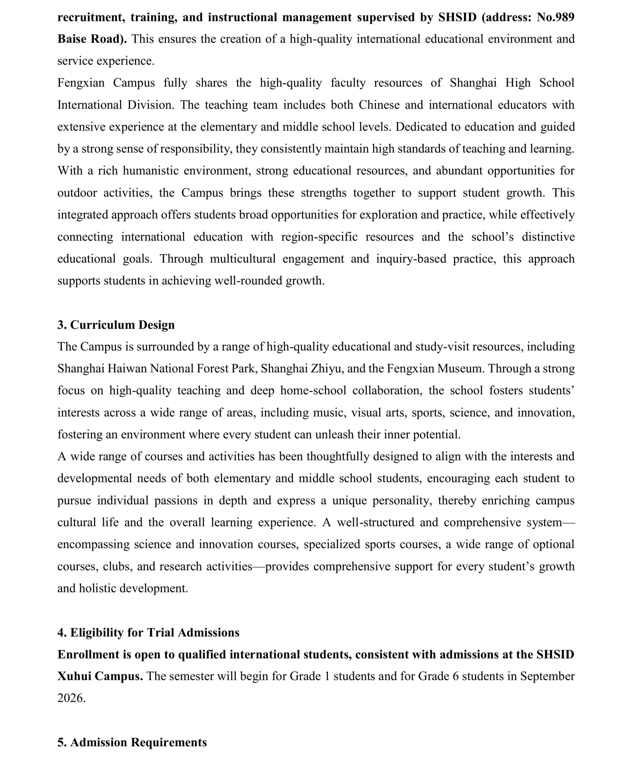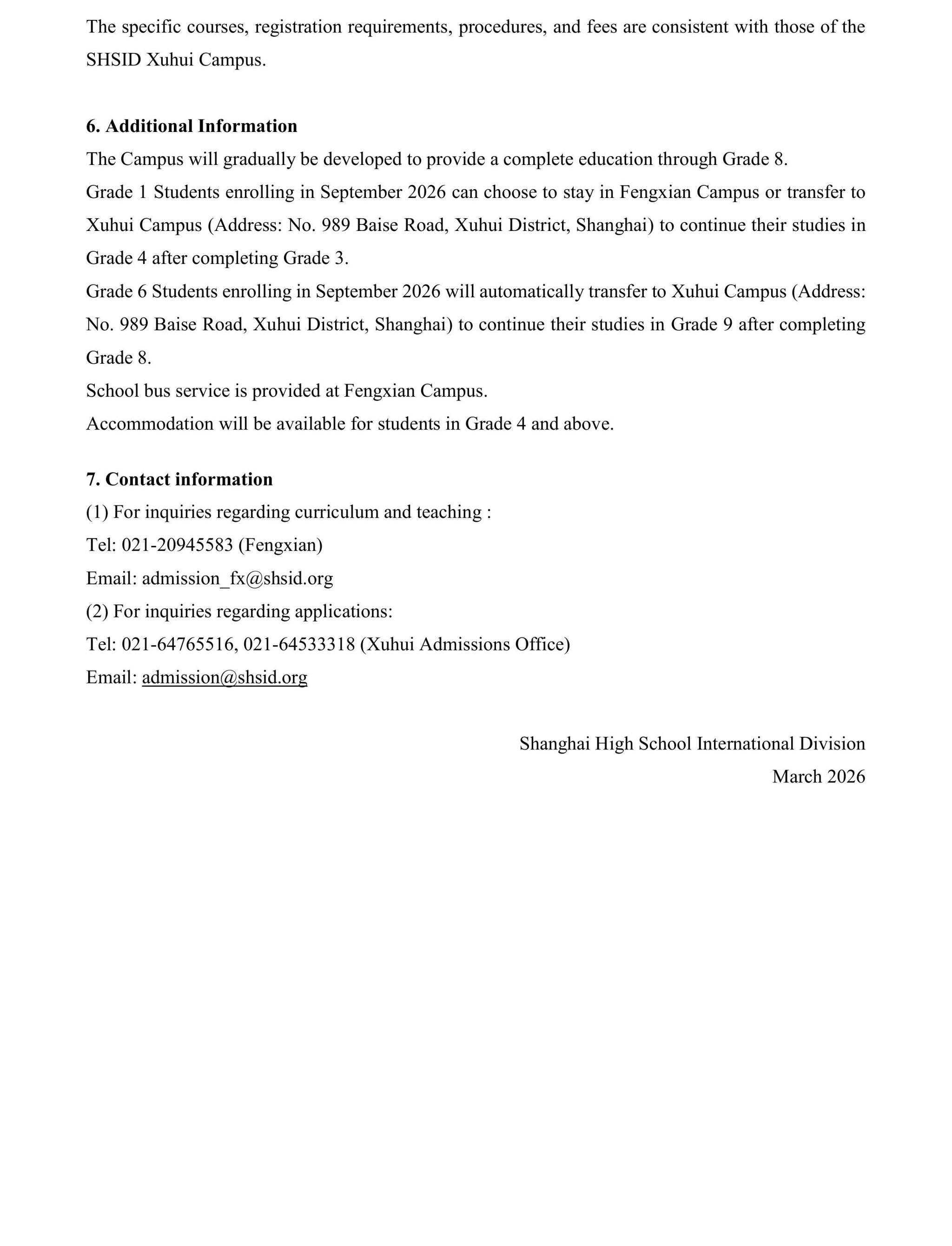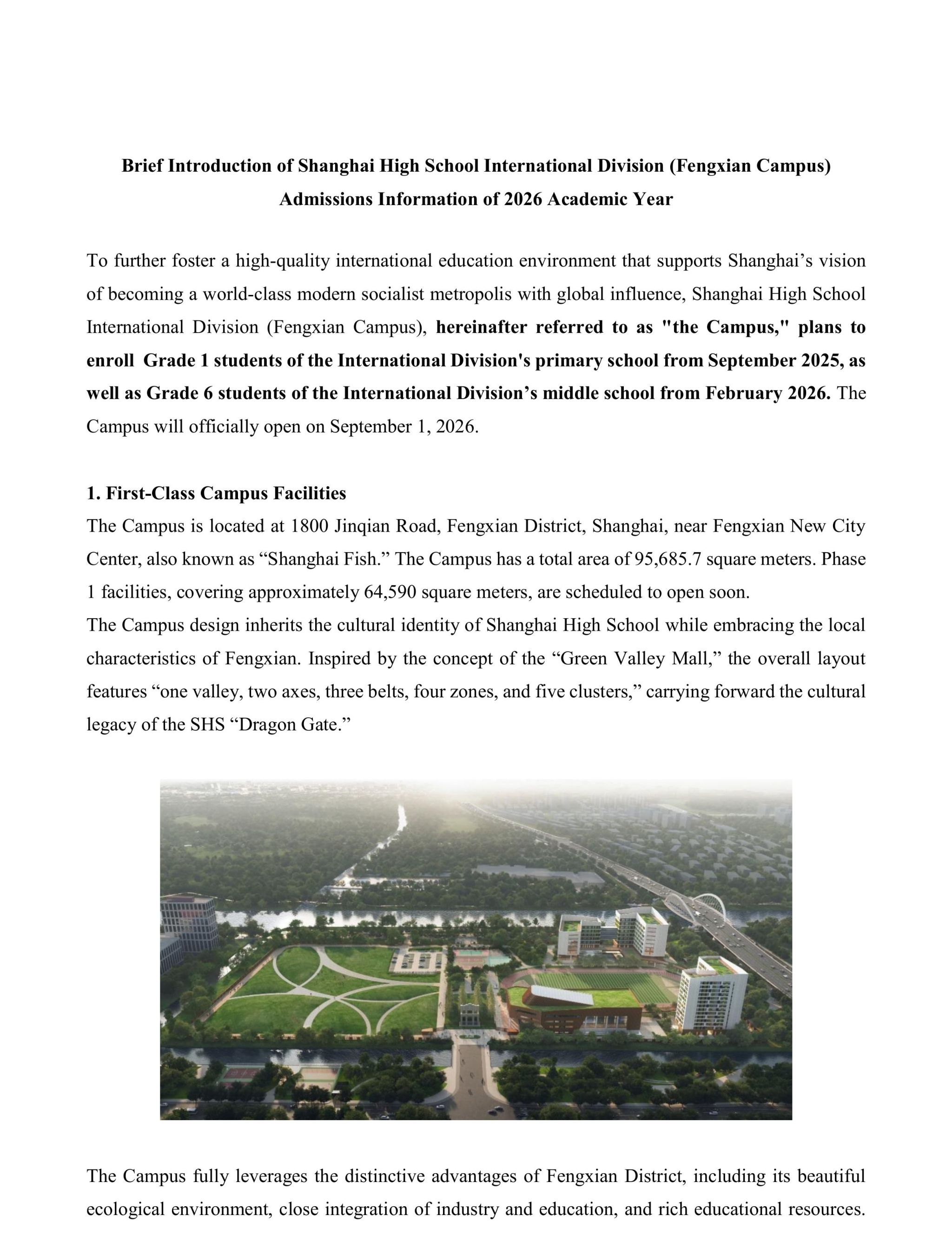 Shanghai High School International Division (Fengxian Campus) Admissions Information