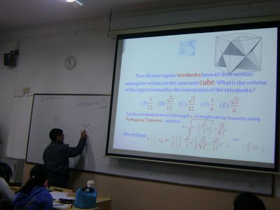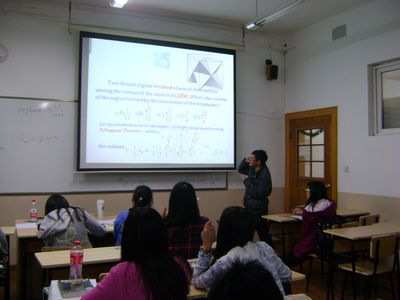 Recently, a speech entitled "Question and Imagination – The Math Story behind an Apple” was presented by Mr. Pan Liu, a professor from Department of Mathematics at ECNU. By illustrating several geometry problems, Mr. Liu emphasized the point that "questioning is the essence of math.” At the end of the presentation, the students were left with a problem to mull over: "If an apple is sliced with a knife six times, at most how many pieces can be obtained?"