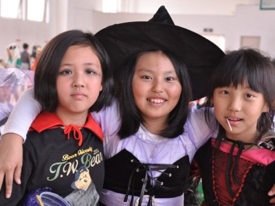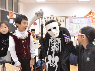 Pudong Grade 5 students held a great Halloween Party on Oct. 27th. Because of the coming mid-term tests, the party was held several days before Halloween. However, the happy air was not affected by this at all. Students put on their special Halloween costumes and played trick-or-treat with their teachers and fellow students. Also, their teachers brought different kinds of candy for them. Some teachers also wore costumes to school to celebrate Halloween with their students.