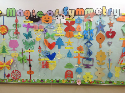After learning about symmetry and lines of symmetry in Math class, the 2nd graders completed an amazing project. They drew their three favorite patterns on color paper, carefully cut them out, and then strung them together. Just look at those flowers, pumpkins, spiders, butterflies, and angels, and one can tell how much time and effort the young students put into their intricate designs.