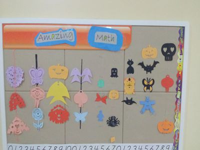 After learning about lines of symmetry, we did a project pertaining to this concept. The students folded color paper, drew the outlines of various shapes, and then cut out the shapes. After that, they used string to connect the different shapes together. Some students chose Halloween colors, using black and orange paper to create pumpkins, ghosts, bats, and so on. The best projects are on display in the hallway.