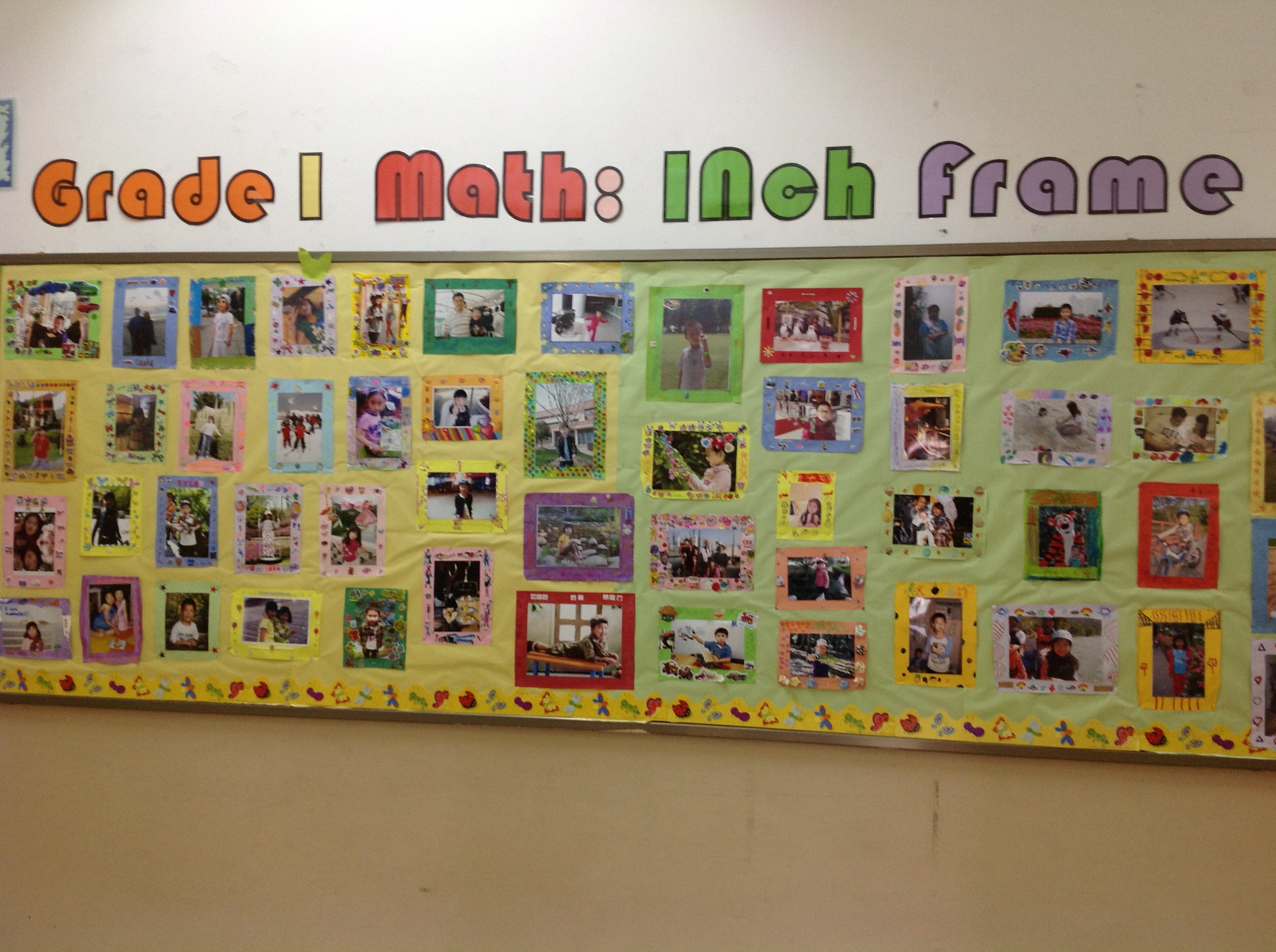 Our first graders learned measurement in Math class this month, they studied about inch, foot and centimeter. They not only learned the theory of these lengths, but also made practical application of these contents in daily life. Look! They are making an inch frame! First, they got a favorite photo of themselves. Then, they made a frame for it and made sure each side was one inch long. Last, they used color pens and stickers to do some decorations for their inch frame. Wow! These elaborate frames are in the hallway now, waiting for everybody.
