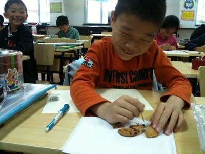 We had a cookie experiment last week in Science class. This cookie experiment is about mining the chocolate in the cookie using a stick. Our teacher Mr.Wayne gave each of us a cookie, a stick, a paper to record, and a piece of napkin. We were asked to mine out the chocolate beans without breaking the cookie. Some people broke the cookie, someone didn't. After mining it, we were required to finish recording the process.It is fun, and it helped us to remember what we learned.