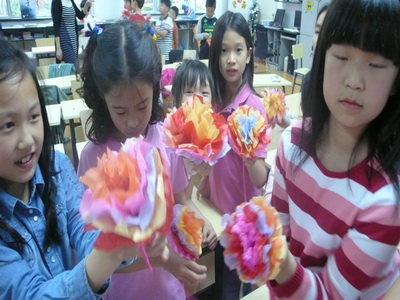 During last week's Personal Growth class, we made paper flowers as gifts for our moms for the coming Mother's Day. Our teachers prepared some colorful paper for us, and taught us how to fold the paper into flowers. You may use scissors to trim the angles of these paper to make the flowers more beautiful. The last step is to make the flower fluffy. Almost everyone did a good job, and we can present these flowers to our dear mom as Mother's Day gift. It was a great class!