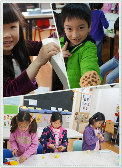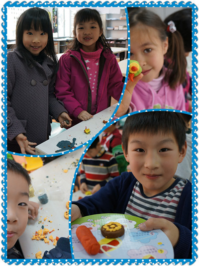 Start from this semester, our activity class will have themed activity each month. For example, March is Clay month. Teachers ordered related materials accordingly. The topic this time was “Making Cookie” and kids were divided into two groups. Some kids would think twice before starting, others would think while making or cooperating with each other. Their final works were very creative and kids can bring them home. Great fun!