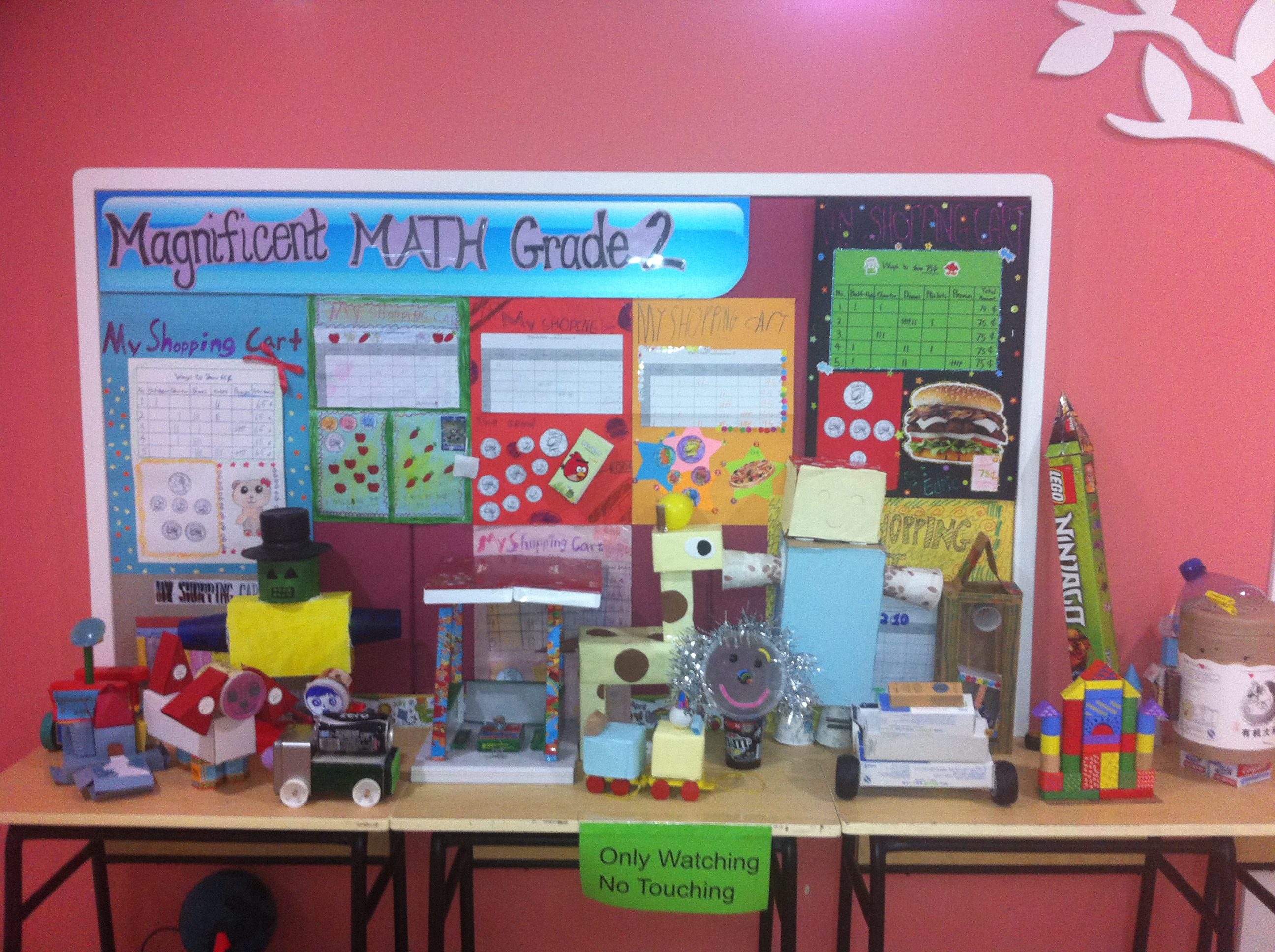 Our second graders brought their winter holiday math projects to school on the first school day. Almost everyone made their efforts to produce creative projects by using different solid figures found in daily life. They made cute robot, lovely giraffe, castle with bright colors, etc. All these amazing projects are on show in the hallway now. Let’s go and have a look.