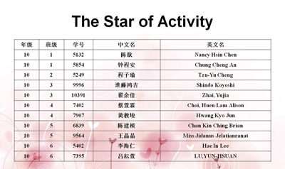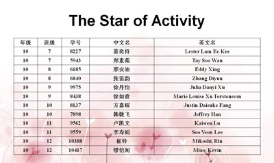 During the Opening Ceremony, Ms. Su, the grade supervisor, announced the list of student awards of the last semester. The awards include GPA Star, BQH Star, Leadership & Organization Star, Activity Star, Sports Star, and Rapid Progress Star, which conclude the achievements of the students. Hope they can make greater progress during this semester.