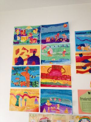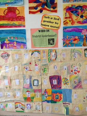 The third graders learned who Friederich Hundertwasser was during Art class.He was an Austrian artist and architect who hated straight lines and loved color. The kids learned his style of bringing nature into the city.They worked on the Art project. After making a window, they combined each work together. The puzzle was solved. It was an apartment building. All the third graders lived in it. They really liked the fantastic idea.