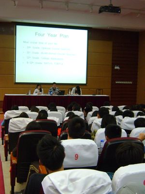 On Wednesday afternoon this week, students in grade 9 gathered together in the Annex auditorium to have an interesting and meaningful CAS class. Andrew, Tiffany, and Jenny, three students from the eleventh grade, told us a lot of information about the AP and IB course, activities, skills to manage our time efficiently and how to write a useful four-year-plan.