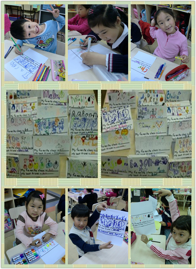 The first parents meeting has came after two month's school life. In order to welcome our parents, Grade One kids had made special name tags with nervous and exciting emotions on Personal Growth lesson this week. Parents could find their children's workbooks, materials, tables and cubbies more easily. We are in a very warm family including kids, parents and teachers.