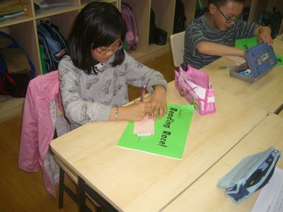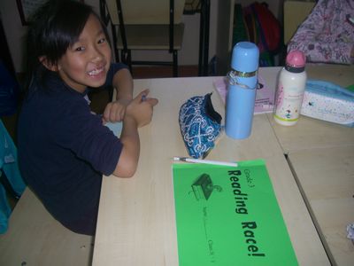 Reading race starts from Week 7. It will last one month. The goal for the third grader is to read 12 books which should include 6 English books and 6 Chinese ones. They found a huge mountain poster in the hallway with some climbers beside it. Each climber stands for one class. The class who read more books will climb higher on the mountain. Everyone got their reading race packet and made a book mark to get prepared for the reading race. All the third graders enjoy reading. Reading is fun.