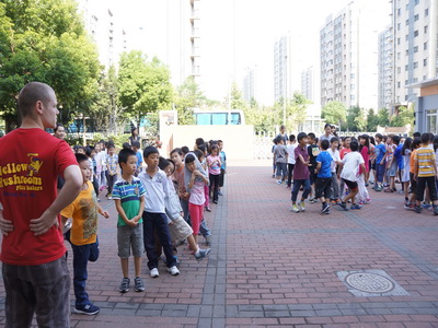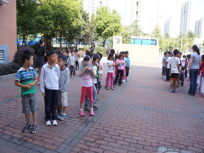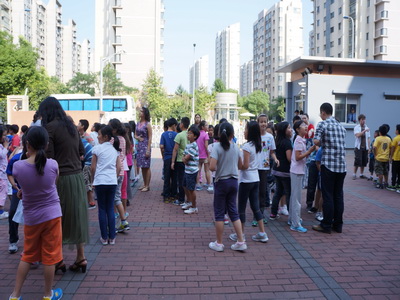We talked about some basic knowledge about "what are you supposed to do when there is a fire". When there is a fire, the most important thing is to calm down, and get out of the fire place quickly and quietly. If possible, please also get yourself a wet towel to get rid of the smoke. What else, it is recomended to crawl out of the fire place. Students should follow teacher's directions and be quiet. After talking about these basic knowledege, we started our fire drill. Students line up quickly and quietly, and went quickly to the playground.