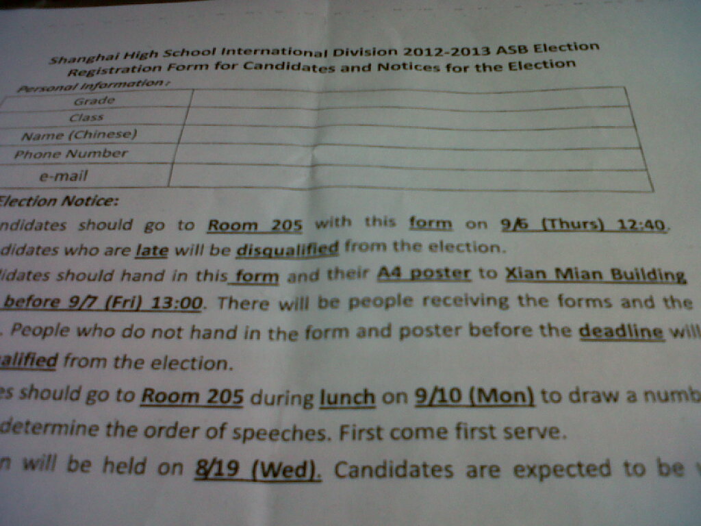 The ASB election will begin soon. The candidates will go to room 205 and the detailed requirements and process of the speech will be noticed to them.They will hand in the poster of self-introduction to XMT lobby. The order of speeches will be determined on 9/10.