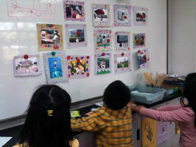 The first graders made picture frames in math class. In our math class, we’ve learned something about perimeter. Students brought their photos to school, and teachers prepared color paper for them. They tried to use the knowledge about the perimeter, and made beautiful picture frames with the color paper. Look, in the photo, we are showing our work to our classmates.