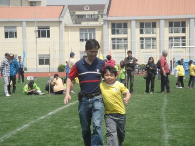Teachers thoughtfully arranged for children in grade one and two a parents-child campaign, three-legged race. Parents and children cooperated well and some practiced earnestly before the campaign.
