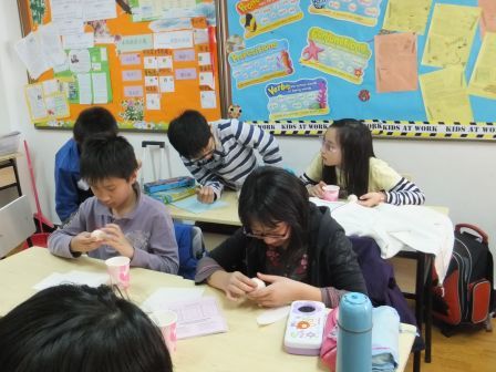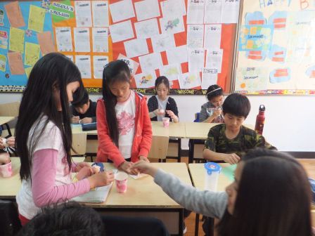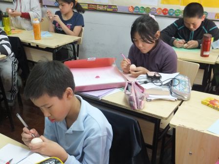 On Friday, to celebrate the Easter holiday and the coming of spring with the G5 students, the students played outside to enjoy the fresh spring air and then came inside to decorate eggs, as is tradition in many parts of the world. The students had choices of using markers, colored pastels or 'paper mache' to decorate the eggs. Many students in 5-1 and 5-2 chose to try paper mache, which involves soaking colored paper in a mix of water and glue, and carefully sticking the colors on. We left the paper-mache'd eggs to dry on the window sill over the weekend, and on Monday, they looked great! This was a new type of arts & crafts experience for many of the kids. Happy Spring!