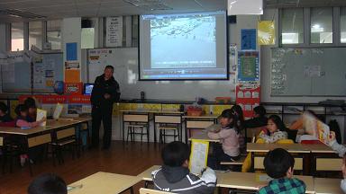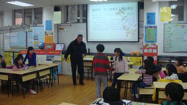 In order to teach 2nd graders how to cross the street safely, we had a traffic police officer come visit the 2nd grade to talk about traffic safety. First, the traffic police officer told 2nd graders the importance of traffic law and regulations. Then, he taught us how to cross the street safely. Considerate Ms. Wei and Ms. Tharrington set up their desks like an intersection. With that, the traffic police officer could show us the standard procedure of crossing the street safely.