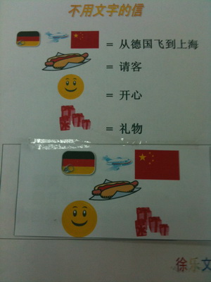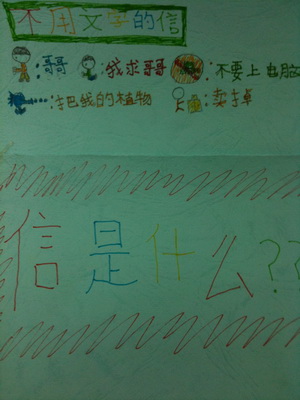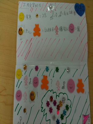 This week our Chinese teacher asked us to design a poster. The topic is to write a letter without using a word. Everyone works hard on this special poster. First, we drew some special marks on the paper. Then we used these special marks to write a letter. Last, we translated the marks to words on the back of the poster. We found it is very interesting, and we are all satisfied with our posters.