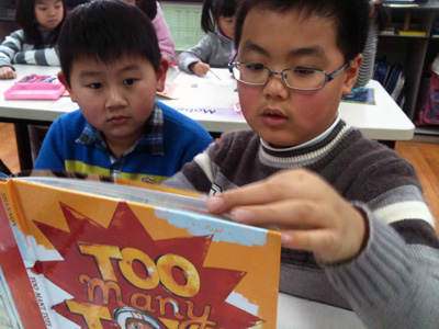 Grade 1 students read books with grade 4 and grade 5 students in Personal Growth class. The partner reading is a traditional activity in our school. Children were assigned to read a book with a partner from another class. They were able to either choose a book from the reading corner of the class, or one they had checked out from the library. In the activity, they introduced the books they had to each other. It was so fun to have a partner in reading!