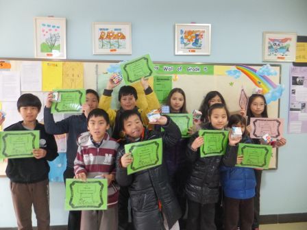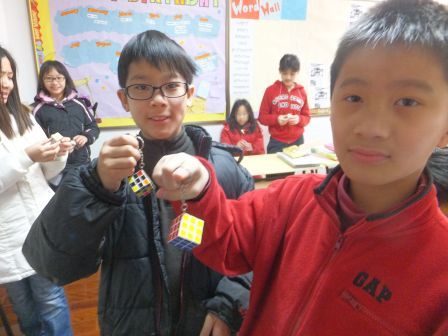 On February 27th ,2012, the fifth graders had an awarding ceremony, after the one-week exciting Rubik’s cubes race. The champion was Peter and the winners are Jonathan, Lena, and Benjamin. Teachers gave each of these four winners a 25-block Rubik’s cube, and the teachers also gave other students who participated in this competition little Rubik’s cubes for fun, because attitude is the most important in the race!