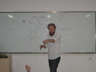 Mr. Ben was invited to give 2nd graders a speech about musical instruments. We went into Mr. Ben's laboratory to develop a concoction of musical elements, instruments, and cosmic sonic landscapes. Mr. Ben began with an illustration of the parts of the drumset and guitar, he drew up a basic example of drumset notation on the board and explained the structure. Then, he demonstrated on the drumset how to play a basic 4/4 beat. Next Mr. Ben gave us a little demo of the electric guitar and its parts. After that, Mr. Ben had a loop set up, he could add instruments into the loop in a live setting. Also, he had a microphone hooked in which allowed him to get our 2nd graders involved. Mr. Ben had them add a bit of vocals or mouth percussion to the loop to create our own original song! Some parts erupted into soaring laughter and others into some pretty nice musical material. Over all it was a very interesting class.