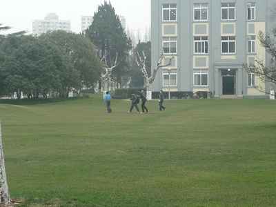 There is a big lawn beside Zhongxing Building. It's spring and the grass starts to grow, too weak to step on.