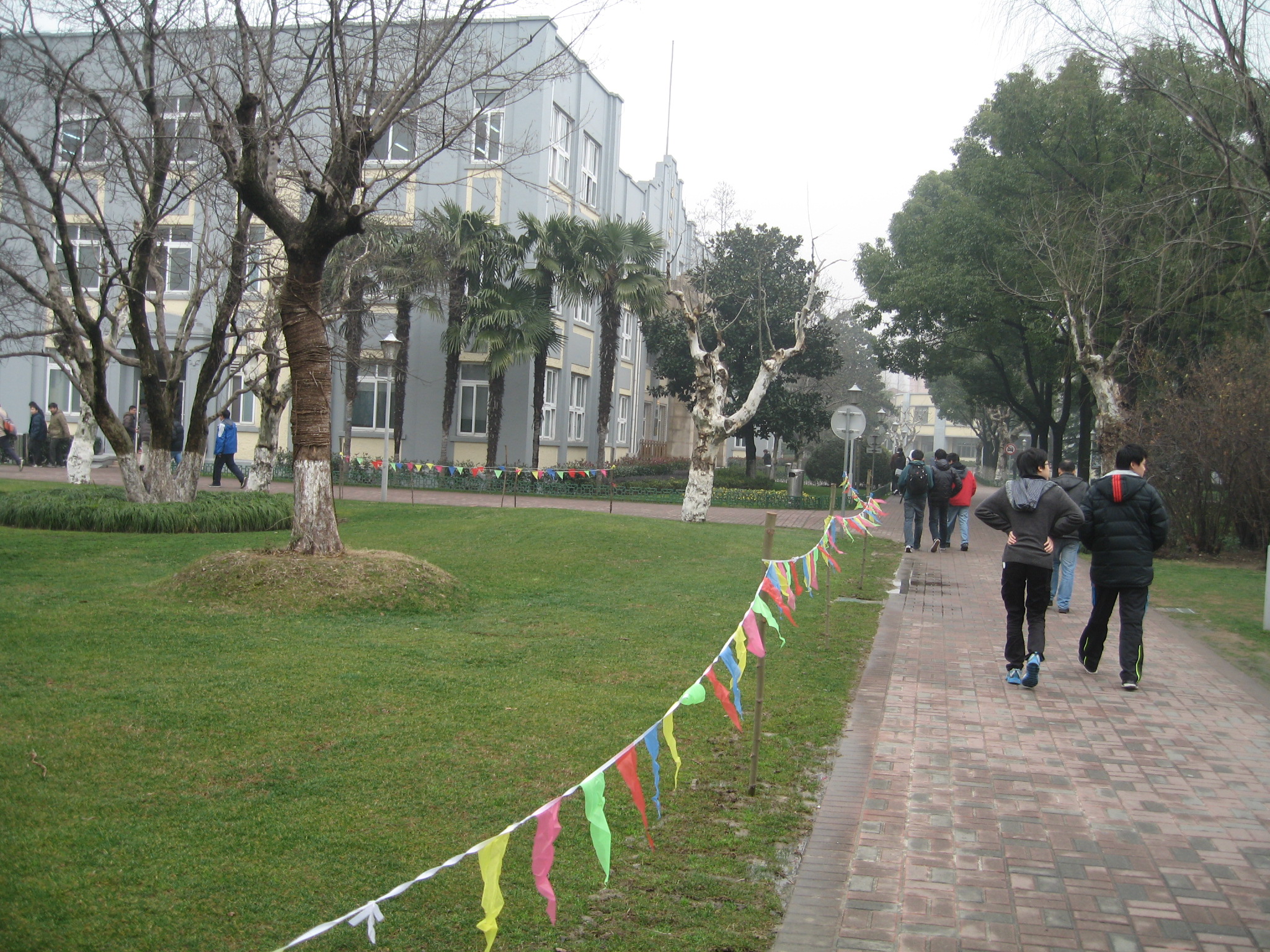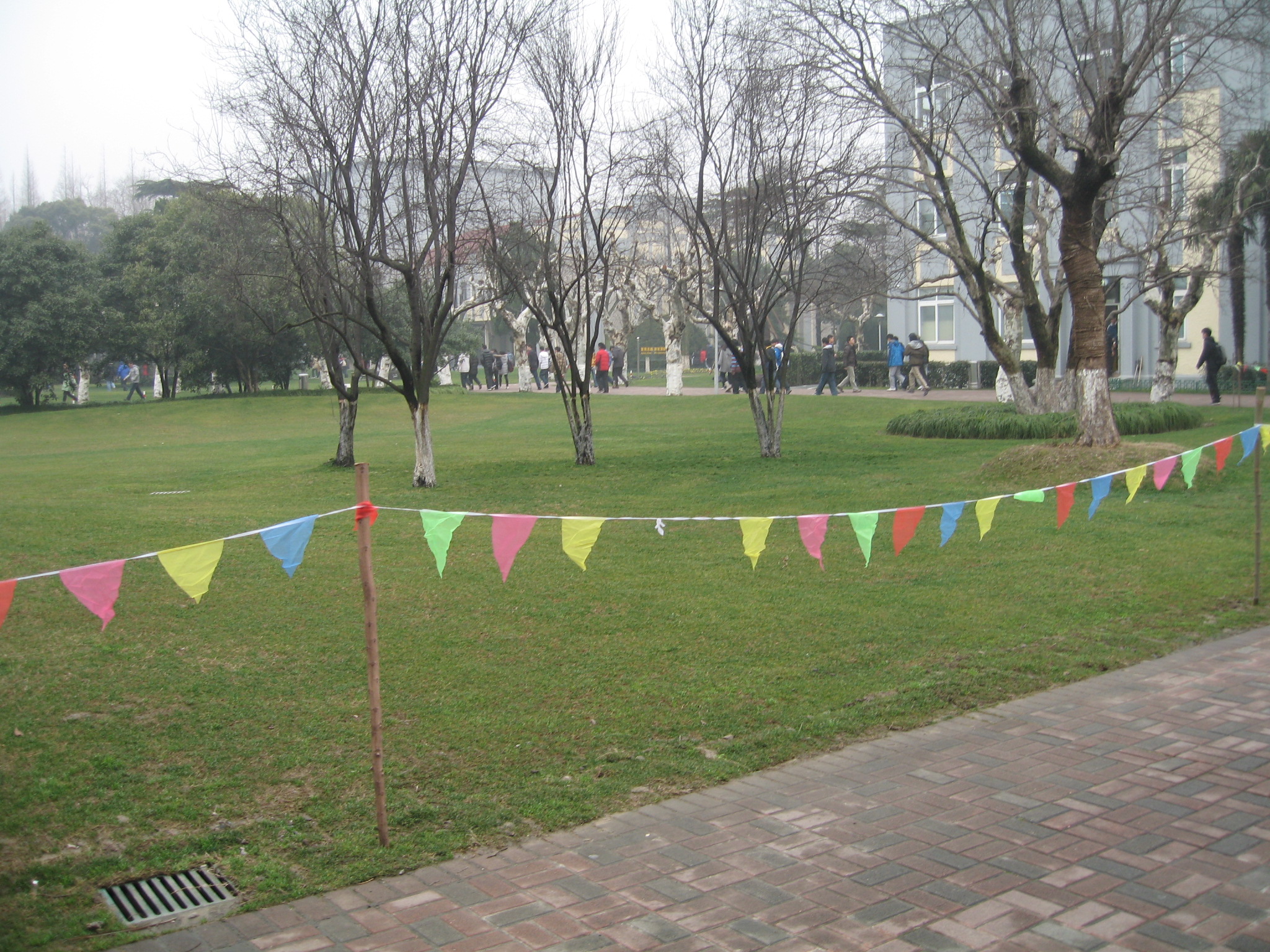 There is a beautiful grass beside the Zhongxing Building.The grass is under the period of irrigation so that the grass will grow healthfully.The ASB members make a proposal that we shall take the action to protect the environment.They will be on duty to guide the crowd.Hopefully everyone will take care of the grass.