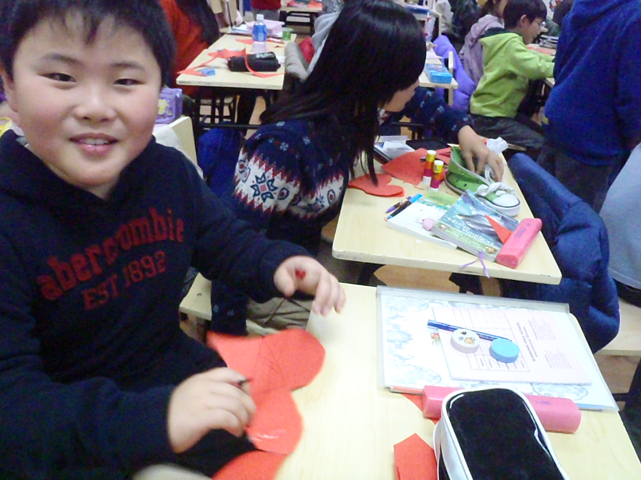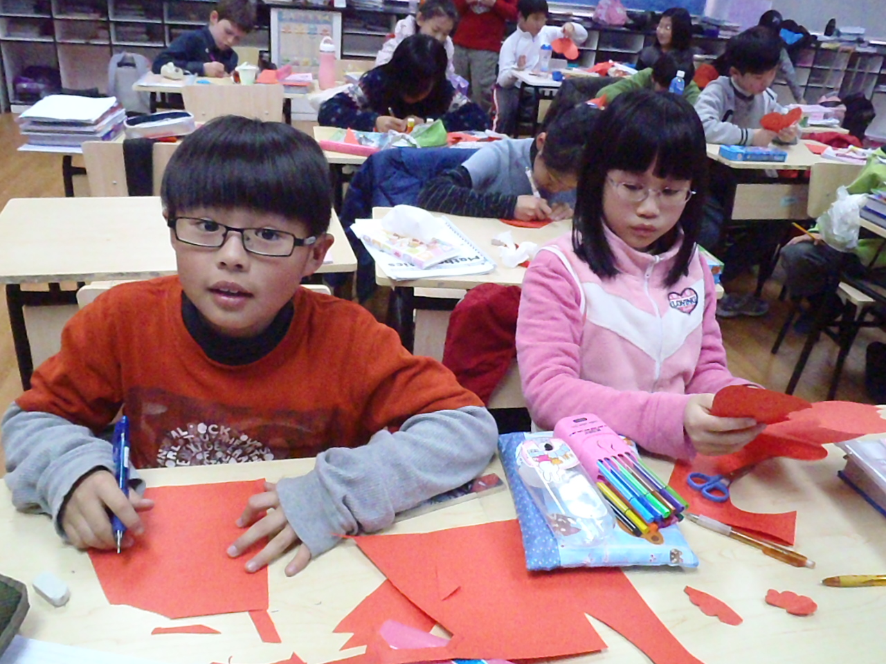 The Third topic of February is“Good Food for Your Health”. During the P&B class, the teacher first introduced some basic knowledge about some food which is good for health. Then the students started to create their own good menu. They cut the red paper as the heart shape and wrote down the menu inside. Those menus were creative and imaginative with beautiful decorations. Some menus were even so detailed with a list of ingredients in it.