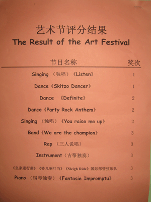 The art festival was quite successful.Each program was marked by the students representatives. The results are out and posted on the first floor of Zhongxing Building.