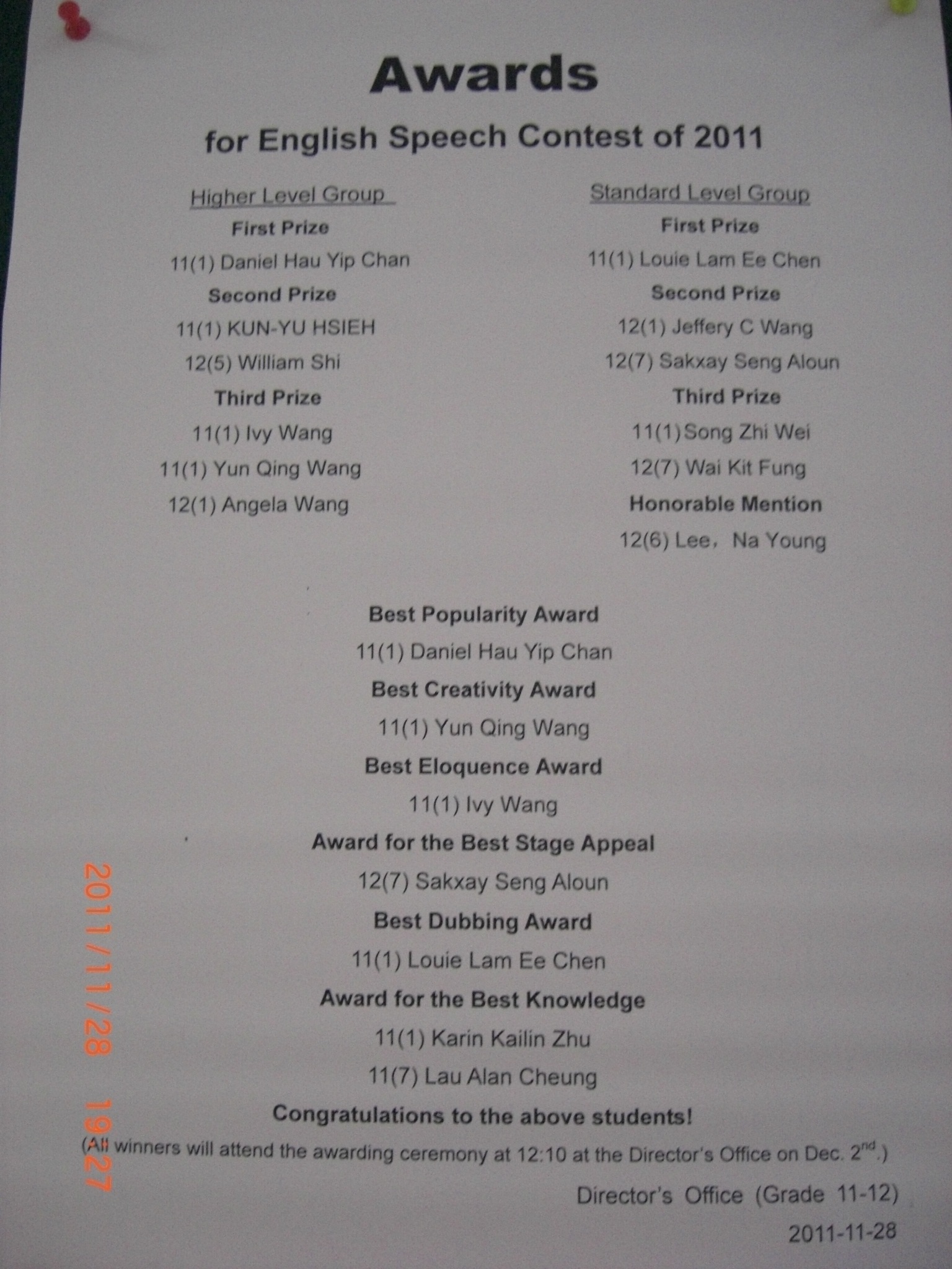 The winner of the Higher Level Group is 11(1) Daniel Hau Yip Chan, and the champion of Standard Level Group is 11(1) Louie Lam Ee Chen.