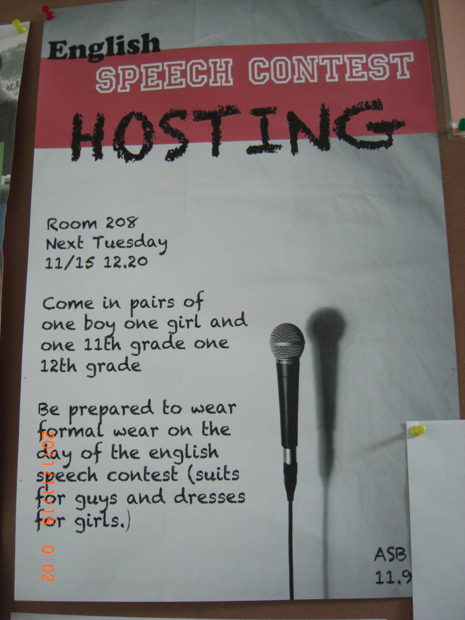 ASB is looking for a host and a hostess since last week. ASB's requirement includes the gender, the grade, and also the language. ASB invited some students to be judges and raised questions for candidates to see if they could handle any emergency. On the contest day, the host and the hostess also need to meet the dress code requirement. Who will be the winner in this competition? Let's wait and see the result of Nov. 15th selection.