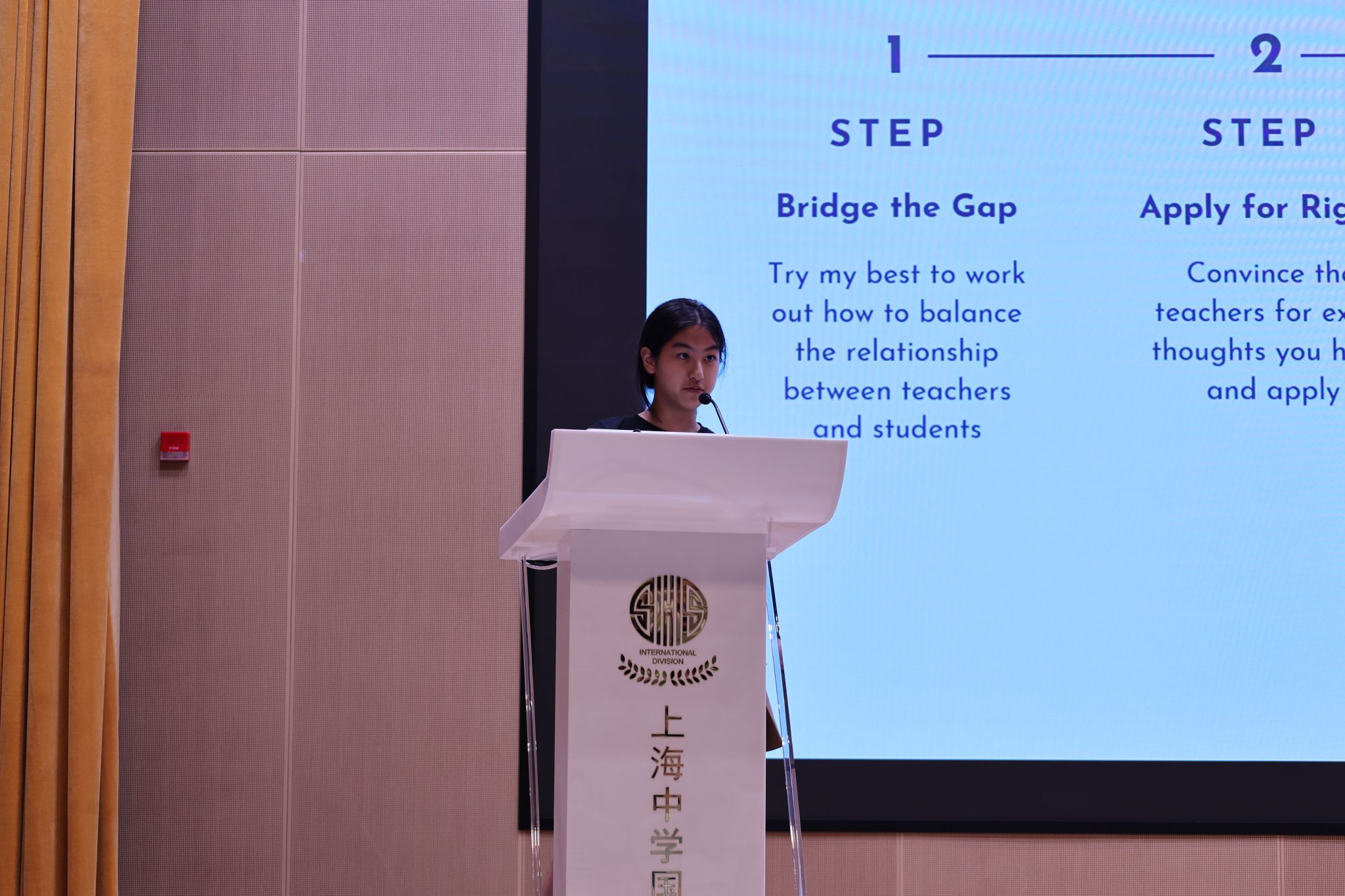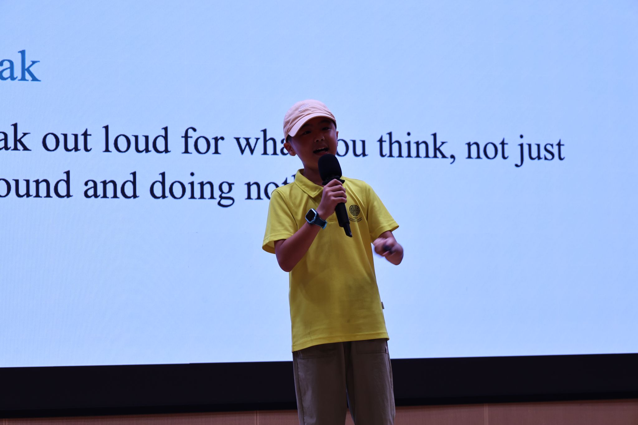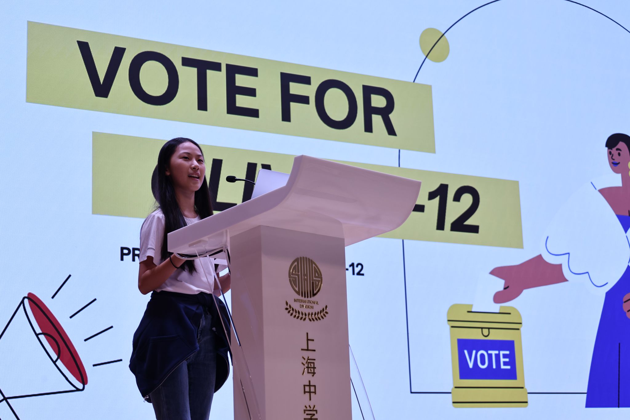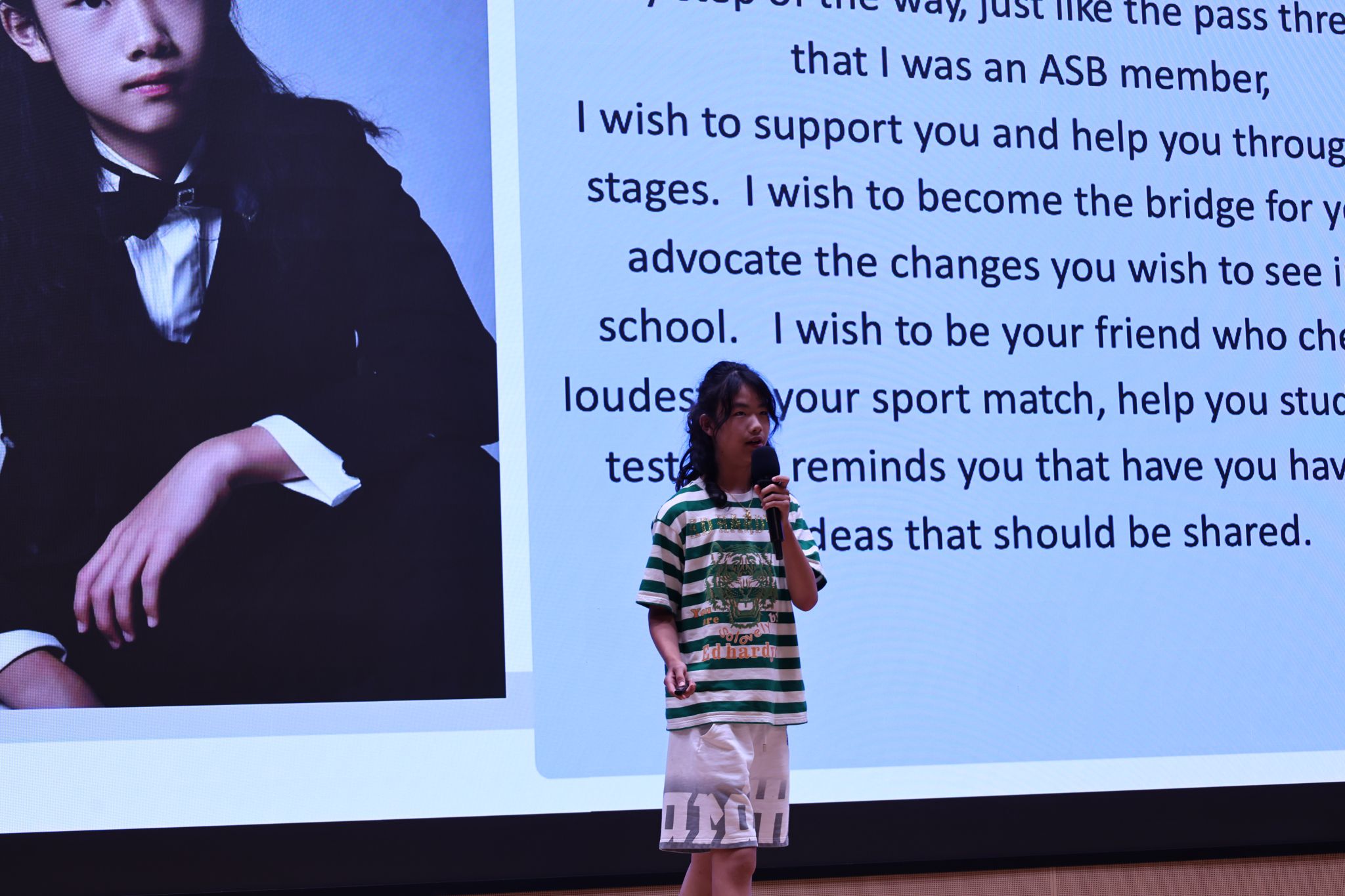 The ASB election was not only a competitive process but also a stage for Grade 7 students to showcase their talents. 23 candidates took the stage. Within the limited speaking time, they presented themselves with enthusiasm, shared their ideas, outlined their visions for serving classmates, and sketched plans for future activities. The candidates also reflected on the responsibilities of ASB members, such as managing time effectively, creating a positive learning environment, organizing diverse activities, and promoting communication and collaboration between teachers and students. Their sincere words and firm commitments reflected a deep sense of responsibility and dedication. The candidates' speeches displayed a variety of styles: some were humorous and entertaining, drawing laughter from the audience, while others were heartfelt, provoking thought and resonating with their peers. The atmosphere was lively, with students responding with applause and cheers throughout.
