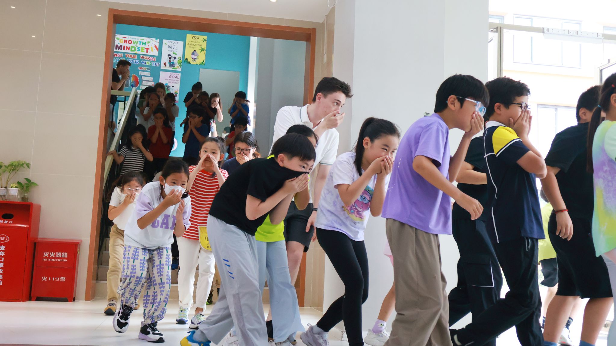 Before the drill, homeroom teachers introduced fire safety knowledge during Personal Growth lessons through engaging animations, interactive quizzes, and demonstrations. Students learned how to prevent fires, why evacuation drills are important, the correct posture of bending down and covering the nose and mouth during evacuation. Teachers also carefully explained each class’s evacuation routes and safety exits. Through group practice and peer checking, students internalized the essential points of fire safety in an interactive way.