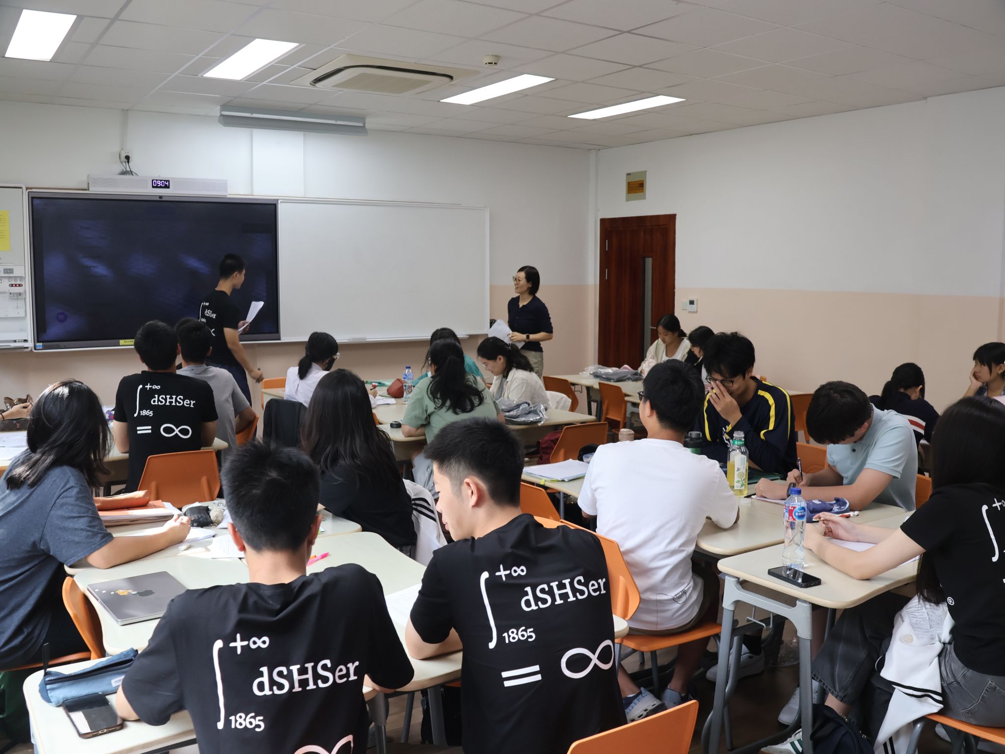 In the 10th-grade physics class, the exchange group and our international students reviewed the kinetic theory of molecules and its four assumptions, learning the derivation of formulas for pressure, average kinetic energy, and root mean square velocity. In group competitions, visiting students actively demonstrated calculations and derivations on stage, showcasing their strong mathematical and physical abilities.