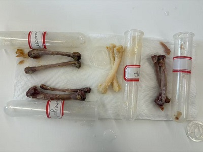 Before the experiment, students made bold hypotheses based on what they had learned in class. They speculated on the effects of water, hydrogen peroxide, white vinegar, and other liquids of their choice (such as lemon juice or carbonated drinks) on the strength of chicken bones. They also tried to predict the changes in calcium levels. During the experiment, students followed operational protocols closely, immersing the chicken bones in different liquids, and observing and recording changes in bone hardness at various stages. Through collaboration and communication, they keenly observed the experimental phenomena and shared the joy of scientific exploration.
