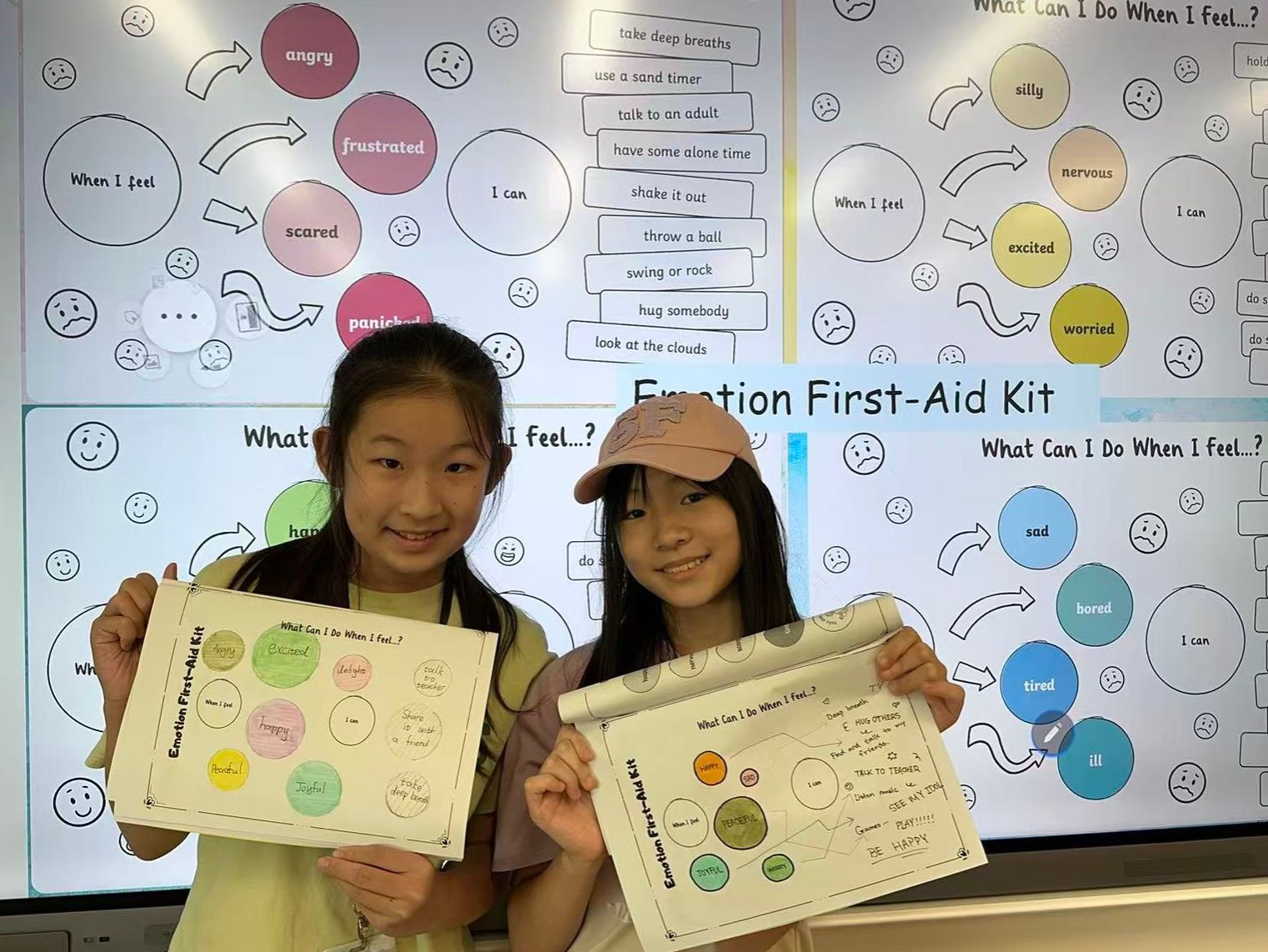 To further understand students' new experiences in Grade 5, the class created "Emotional Weather Charts." Teachers provided weather symbols such as suns, raindrops to represent various emotions. Students chose and drew symbols that reflected their first-week feelings and shared the stories behind them. Many students candidly shared their confusion, nervousness, and anxiety. In response, teachers encouraged the idea of "facing emotions instead of avoiding them," leading discussions on coping strategies. Together, the class created "Emotional First Aid Kits" where students combined scientific methods with personal experience to propose emotion-based solutions. Teachers also reminded everyone that if negative feelings remain despite these efforts, it's important to seek help from parents or teachers promptly.