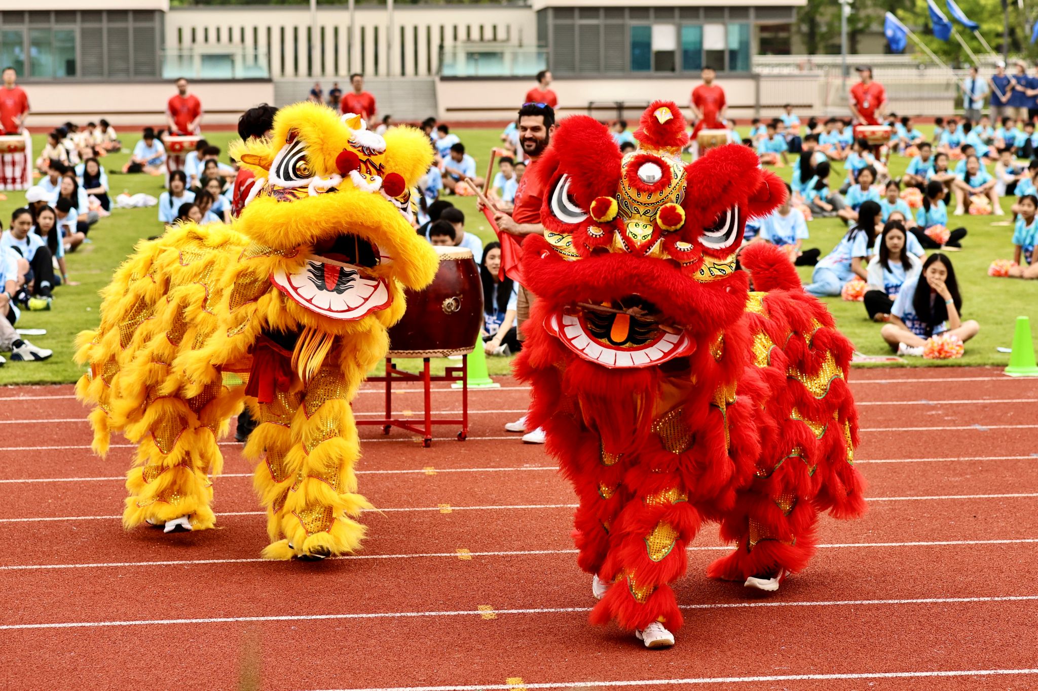 Following the three House performances, the teacher-and-student show brought the spirit of "Togetherness" to a powerful climax. Amid resounding drums and swirling flags, a lion dance team— composed of four international teachers and four students— made a dazzling entrance. The thunder of drums filled the air as the lions leapt and twirled in perfect harmony, symbolizing the unity between teachers and students. With each vibrant movement, the lions "spit greens" to bring good fortune, scattering ribbons and blessings across the field. The audience erupted into waves of applause and cheers, immersed in a joyful sea of celebration. As the rhythm built to its peak, a golden scroll slowly unfurled, revealing the inscription: "160 Years of Shanghai High School— Bound by Affection, Enriched by Generations." The stirring combination of flag-waving, drum-beating, and lion dancing vividly showcased the splendor of Chinese tradition and conveyed heartfelt blessings for the 160th anniversary of Shanghai High School.