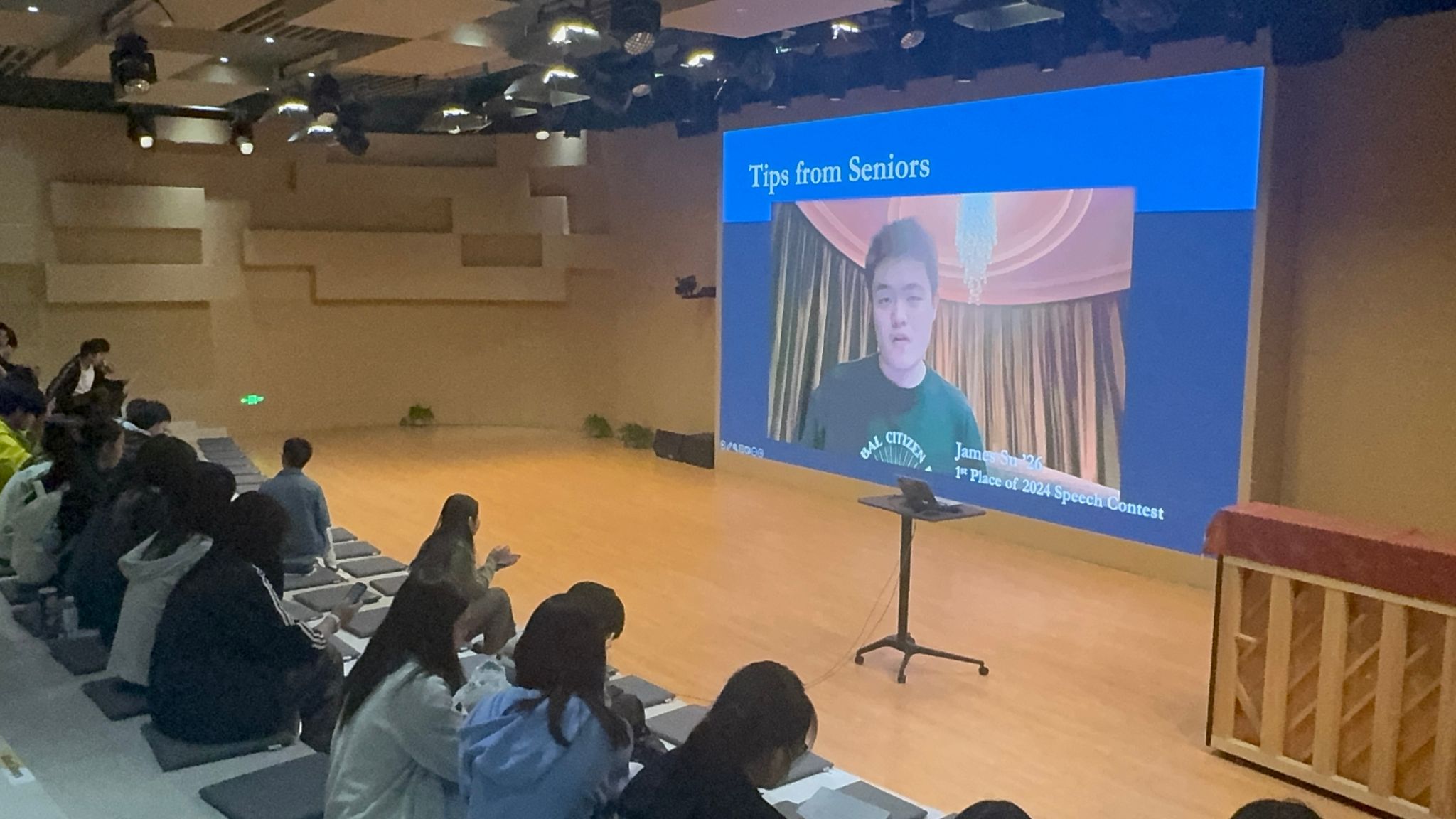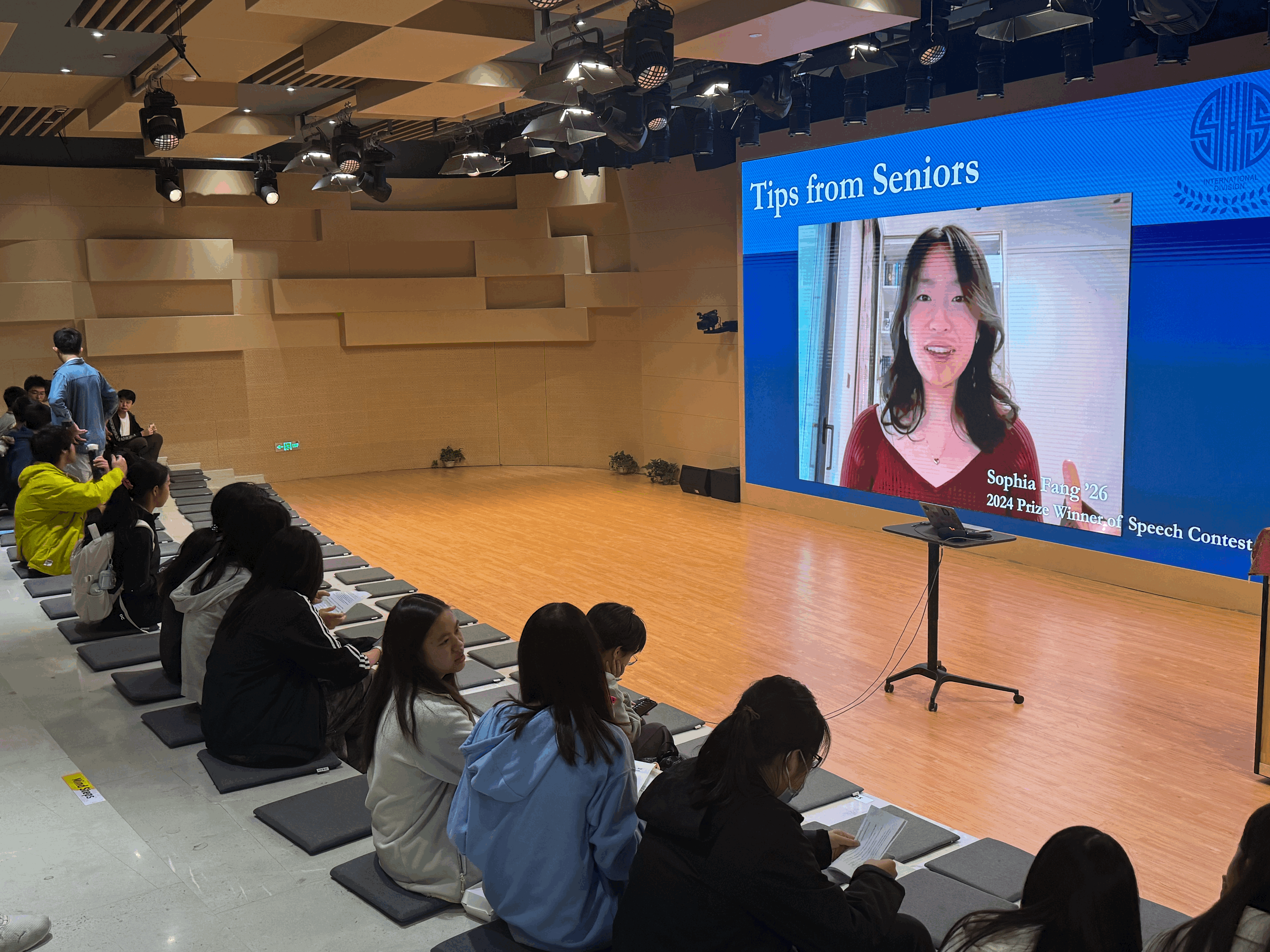 The preliminary round of the G9–10 English Speech Contest took place on Monday, October 27, beginning with a lively Pre-Contest Workshop in the B1 Theatre of the Zhongxing Building. Two senior students, last year’s winners, opened the event by sharing practical tips on public speaking.