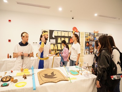 Throughout the exhibition, the students marveled at the ornate details of Corinthian columns, tested the mechanics of a catapult model, and experienced sadness and happiness by trying on the comedy and tragedy theatrical masks. They also sought out literary artifacts, piecing together connections across different aspects of Greek culture.