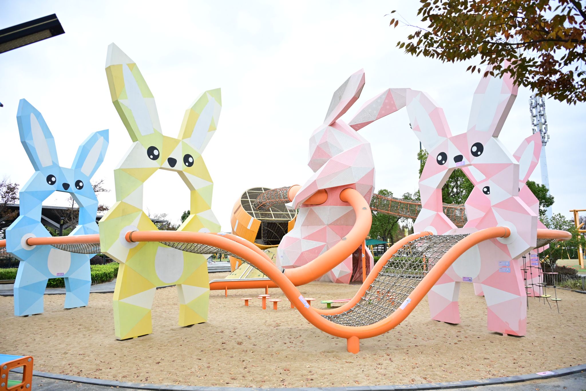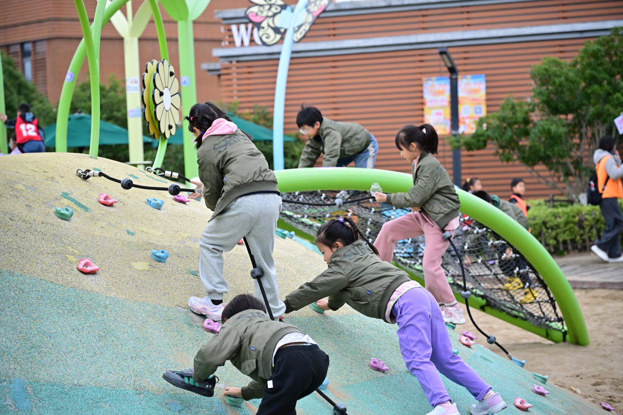 The park is divided into two main areas: “Discovery World” and “Bunny Kingdom.” In the rope-climbing zone, children gripped the nets tightly as they made their way upward. On the challenging “Brave Path,” when one student hesitated, peers offered quiet words of encouragement like, “You can do it!” On the trampolines, kids bounced like joyful deer; laughter filled the swing area; and at the slides, they lined up patiently—every corner brimming with youthful energy.