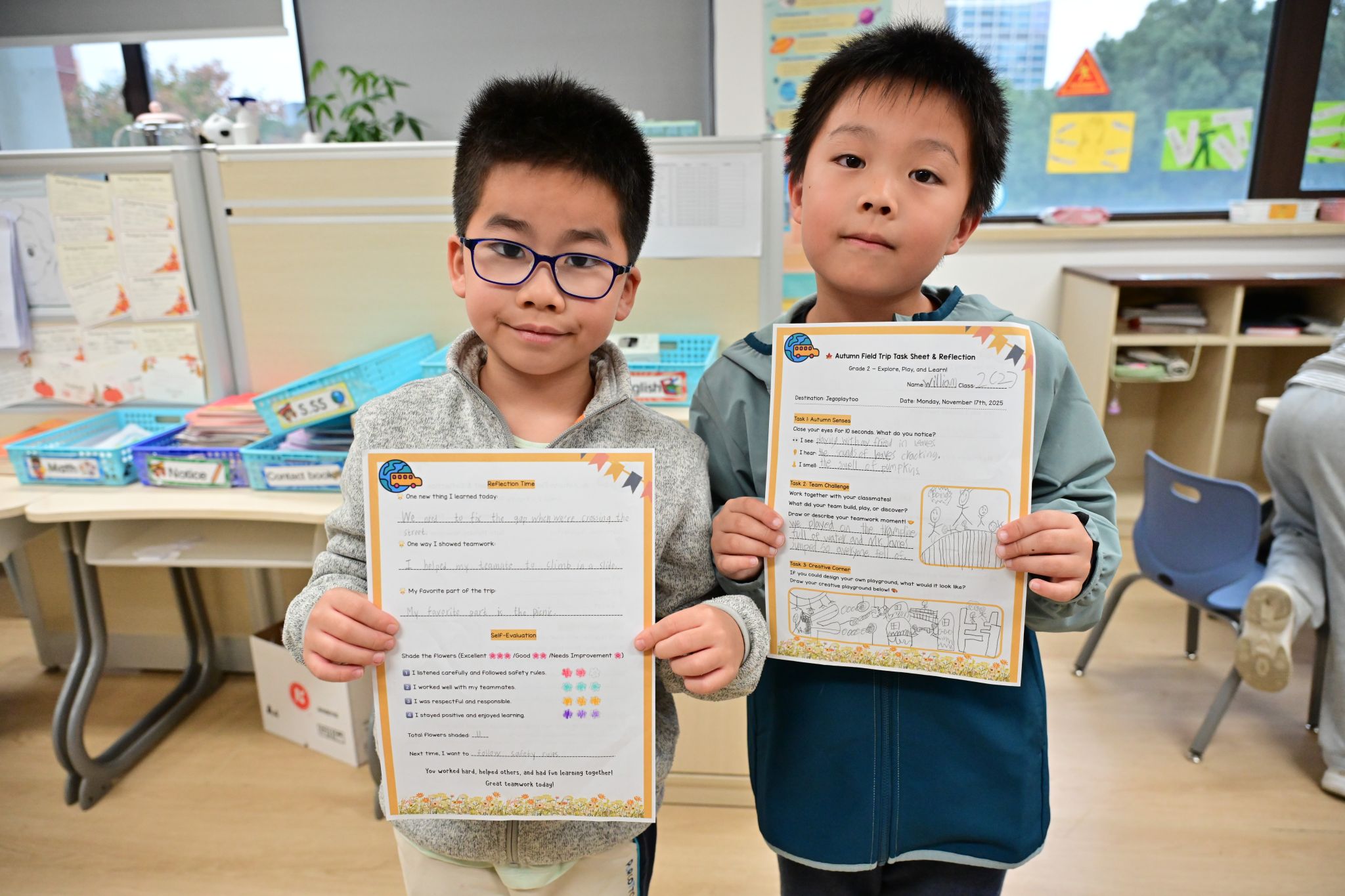 Hongkou Campus designed grade-specific task sheets to deepen the learning experience. First graders drew “Autumn in My Eyes,” capturing golden leaves, blue skies, and smiling friends with innocent charm.