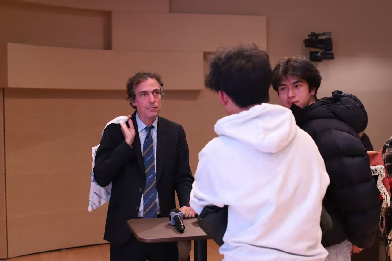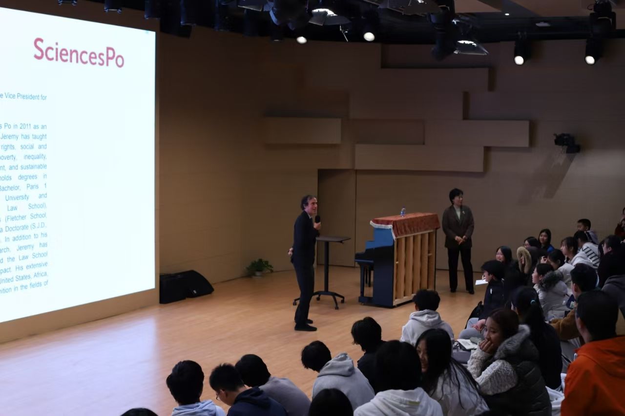 At 12:30 p.m., an information session was held in the Zhongxing Building Theater, drawing nearly one hundred SHSID high school students. The event opened with a bilingual recital by two Grade 10 French learners, followed by a cross-cultural interpretation. Vice President Perelman then spoke about his academic journey and introduced the learning environment, campus culture, and international vision of Sciences Po. Students actively participated in the Q&A session, creating a lively and engaging atmosphere.