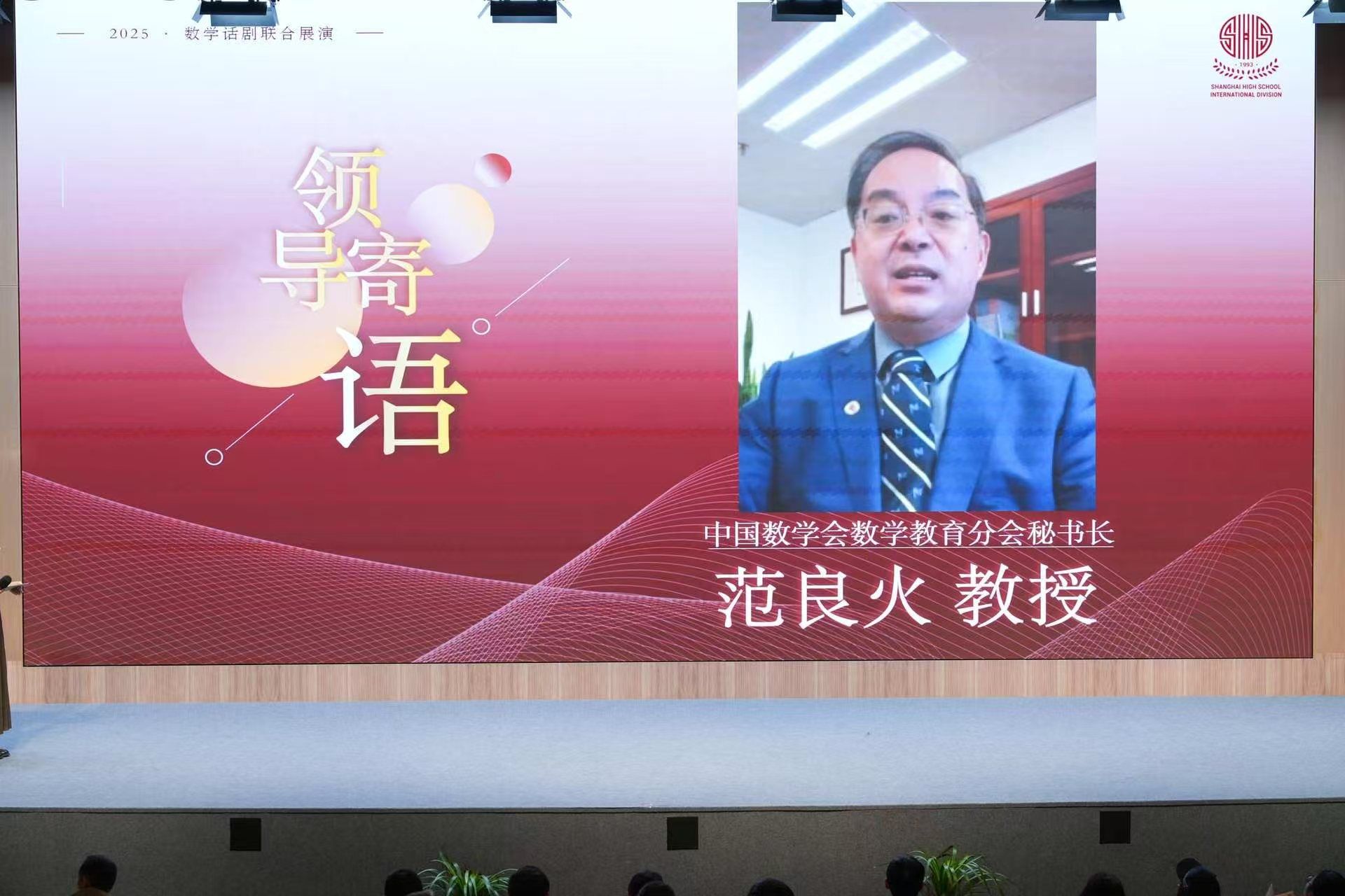 SHSID High School Principal Ma Feng delivered the opening remarks at the Joint Mathematics Drama Performance. He warmly welcomed the seven participating teams and expressed gratitude to on-site experts — Prof. Liu Pan, Mr. Zou Jiachen from East China Normal University, Mr. Fang Yaohua from Shanghai Institute of Education, and Ms. Zhang Shan — as well as Prof. Fan Lianghuo from the Chinese Mathematical Society for his video message.