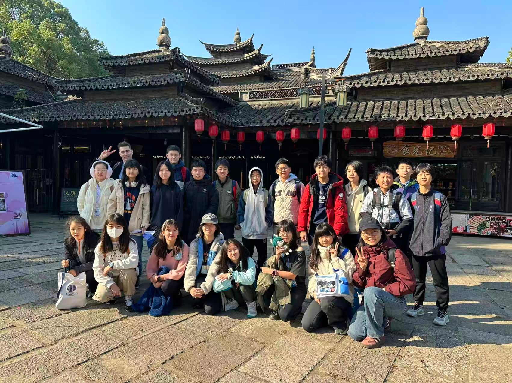 The visit began with a gentle walk along the waterfront. Stone pathways wound past a series of traditional bridges—arched, curved, and flat—each reflected in the calm river below. Students paused often to examine the carved details on the bridge railings and to compare the different structures. With old trees framing whitewashed walls and dark-tiled roofs, the setting felt steeped in history, making the walk an immersive blend of culture and nature.
