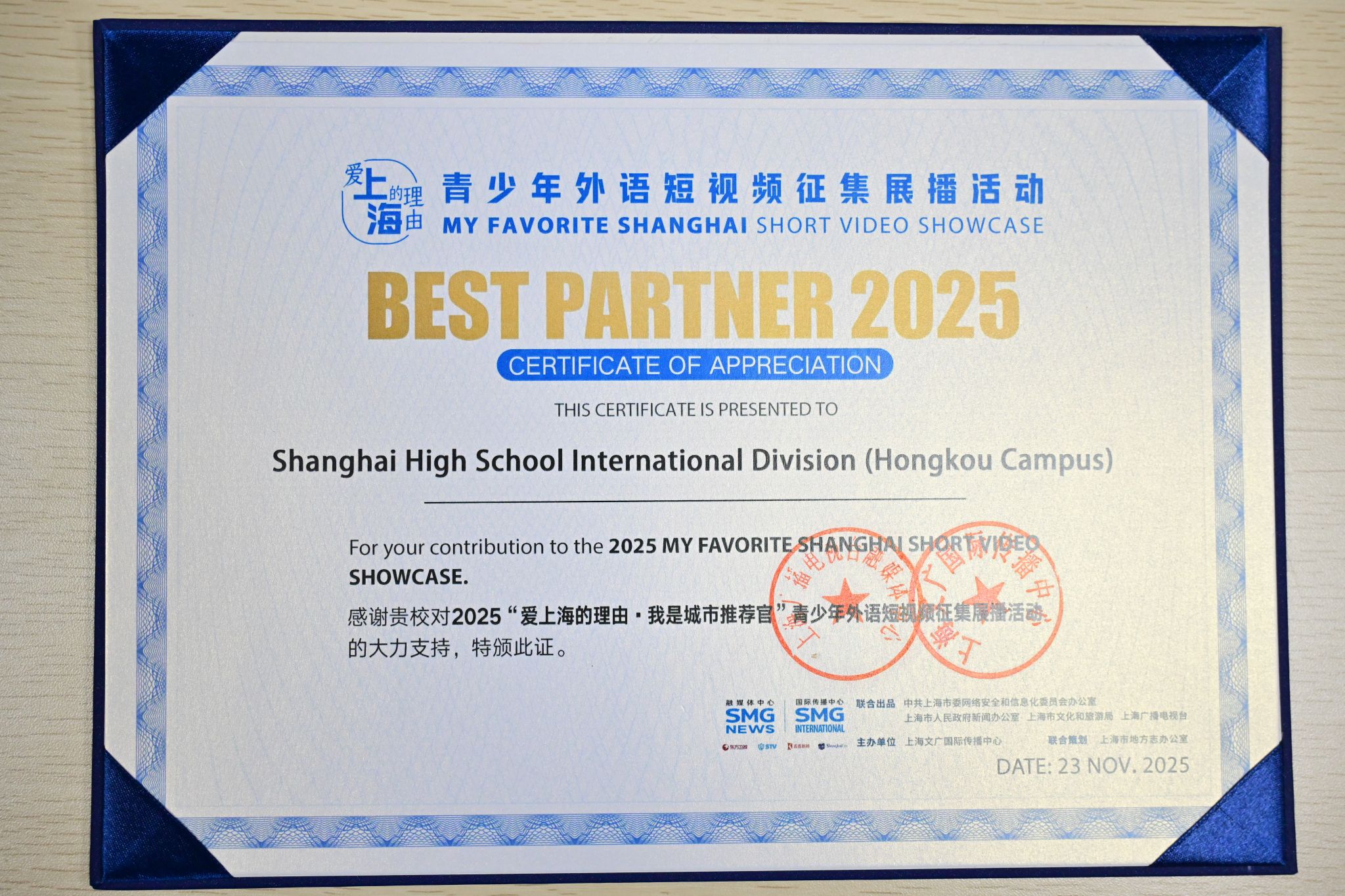 In this highly competitive season, SHSID Hongkou Campus delivered an outstanding performance. From over 20 actively submitted works, five student videos stood out and won professional awards. These works not only offered unique perspectives and refined production but also conveyed profound cultural identity and cross-cultural communication skills through fluent and confident foreign-language narration. Additionally, four students received the "Rising Star Award," and the Hongkou Campus was honored with the "Best Partner" achieving outstanding results in both competition performance and organizational effort.