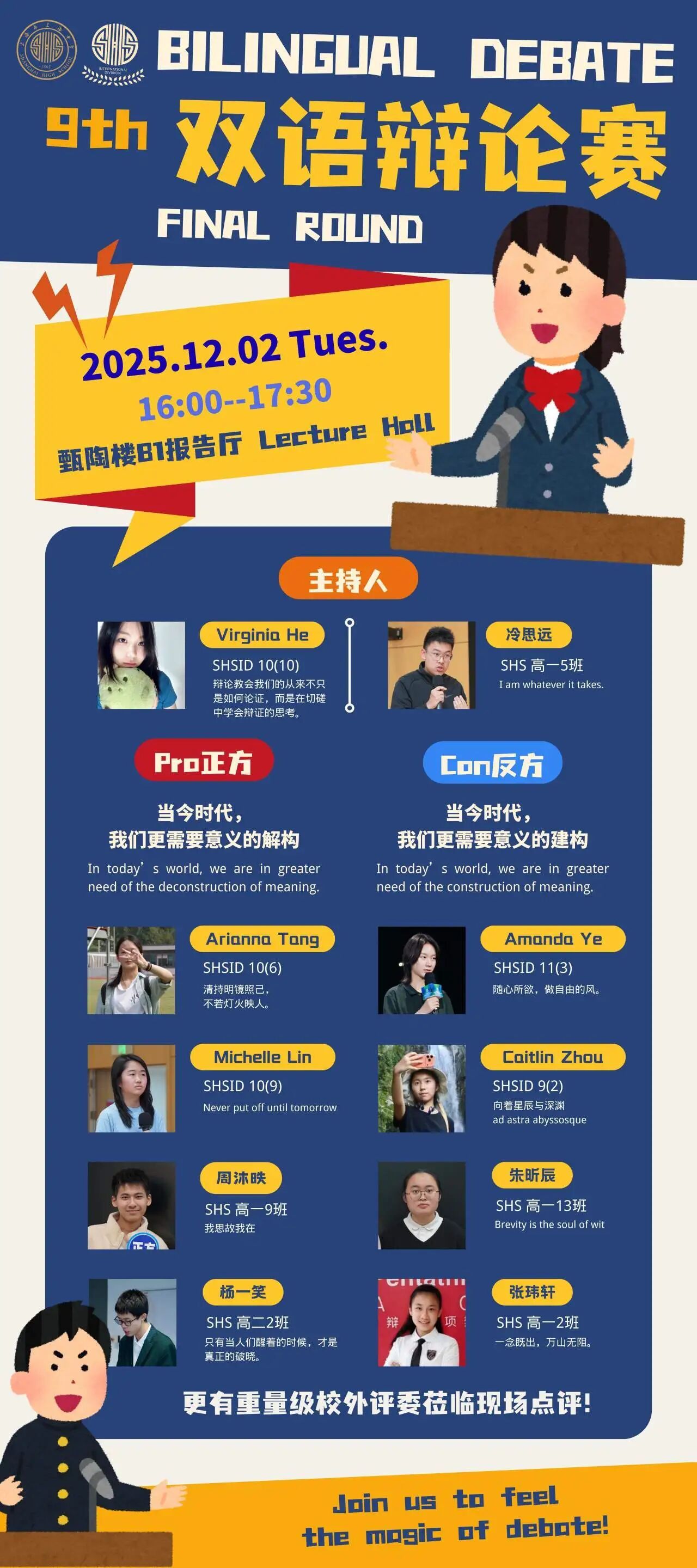 In November, the 9th Bilingual Debate Competition once again took center stage across the campus. It was exciting to see many new debaters join the bilingual debate community, bringing fresh energy and creativity to the competition. After more than a month of intense rounds and intellectual exchange, the tournament is now heading toward its long-awaited final. Since its inception, the bilingual debate has aimed to strengthen communication between the two sections, and its distinctive bilingual format encourages debaters to shift seamlessly between Chinese and English, demonstrating linguistic versatility and sharp critical thinking.