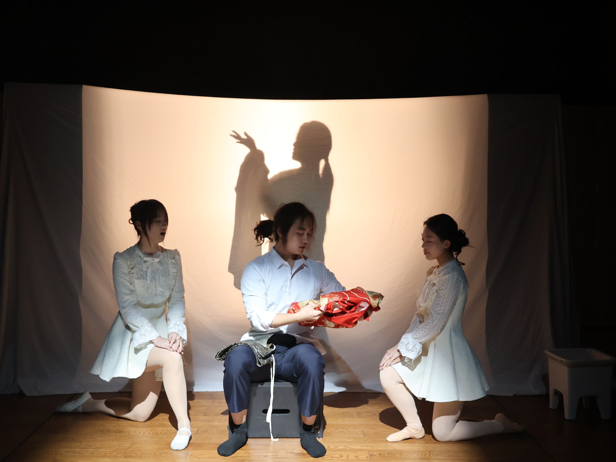 Switching gears from the dramatic intensity of the last play, another group of students presented the culturally rich adaptation from a movie classic. The French diplomat Gallimard presents himself as solitary in prison, delivering a monologue of the shattering reality he had just known. Although adapted from the renowned movie, the nuanced symbolism in this play underscores its masterful originality. Gallimard's choice of applying Beijing opera makeup and wearing the Chinese-red wedding robes, the transformation of the feminine Beijing Opera actor Song Liling into the actual male individual Song Liling beneath, all highlight the internal conflict and conflicts of self-identity among the characters. The novel use of "thought reflecting", angelic characters surrounding Gallimard, further materializes his internal turmoil as he is torn between his idealised fantasy and the crushing truth.