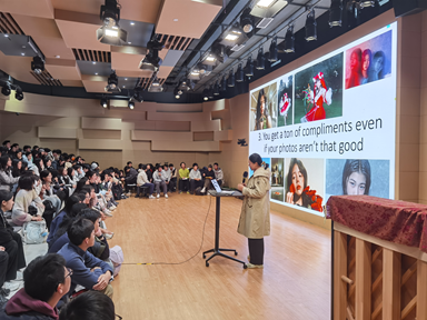 First, Rachel from Class 10 (9) shared her passion for photography and showcased her photographic works from the past six months. She mentioned five reasons for choosing to study photography, such as having a niche hobby, receiving unreserved compliments, and making many new friends through photography. She actively encouraged her classmates to learn photography with her. She also detailed her creative journey in this form of art, helping her peers understand how an amateur "artist" uses photography as a medium to convey her thoughts.
